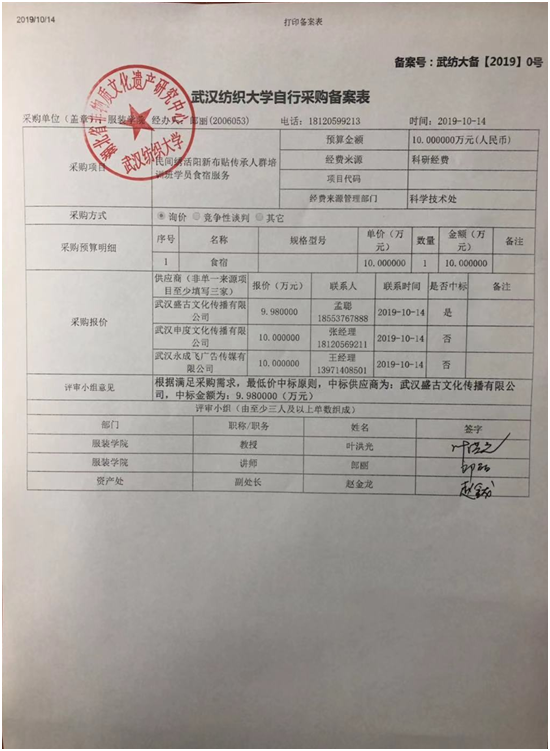 兹由于工作需要,非遗中心自行采购民间绣活阳新布贴传承人群培训班学员食宿服务项目,特此公示。公示期为2019年10月16日—2019年10月22日。