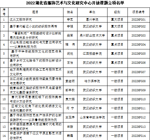 湖北省服饰艺术与文化研究中心2022年度项目已完成专家评审工作,其中《沈从文服饰研究》等14项通过评审。各项目负责人应按照《2022年度湖北省普通高等公司人文社会科学重点研究基地“湖北省服饰艺术与文化研究中心”基金项目申报说明》的有关规定,完成相关研究工作。所取得成果均需标注“湖北省服饰艺术与文化研究中心2022年度课题资助项目”字样,方可作为结题验收成果。
