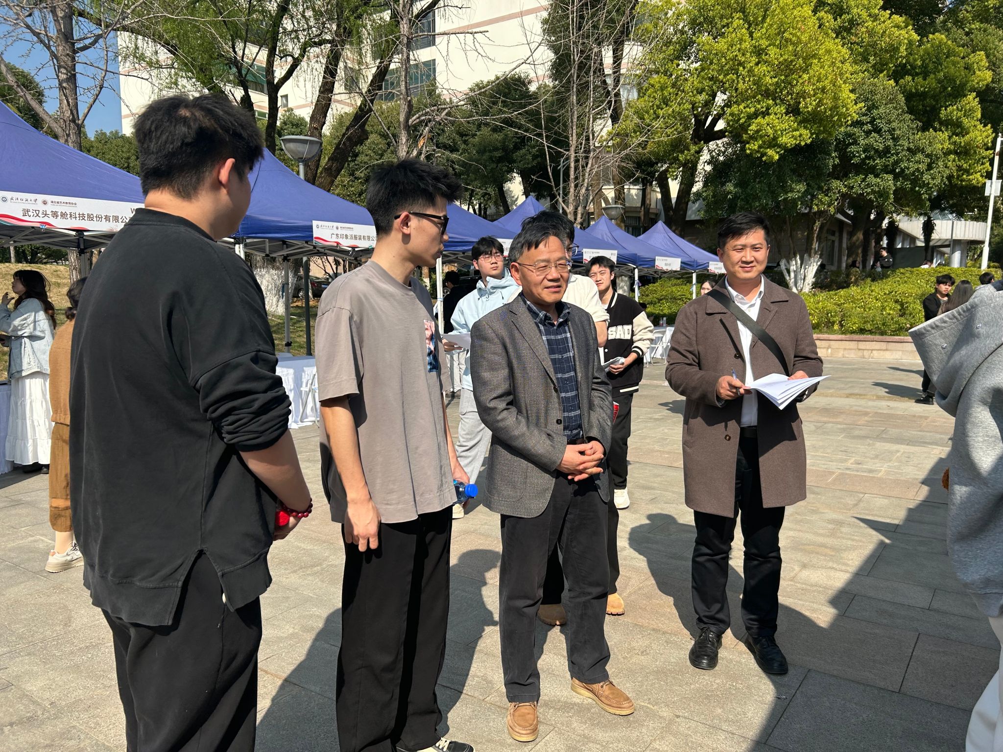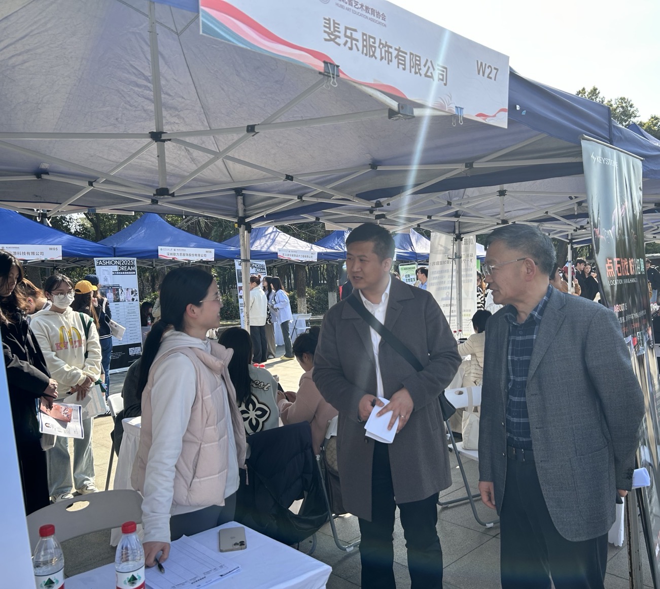 招聘会现场,公司领导一行先后走访了歌力思服饰有限公司、斐乐服饰有限公司、员工企业拾米文化公司等展位,详细了解企业招聘需求、行业发展趋势及对毕业生能力的期待。杜新年表示:“服装产业正面临数字化转型与国潮崛起的双重机遇,公司将紧扣市场动态,优化课程设置,培养既懂设计创新、又具备商业思维的应用型人才。”