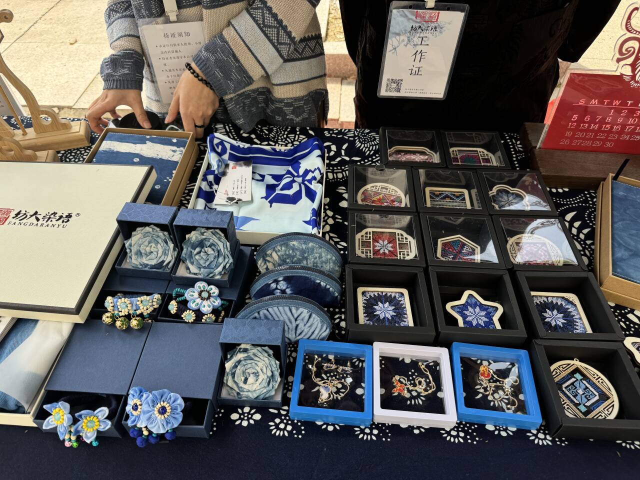 一靛青蓝染千年,十指春风绣荆楚。来自纺大染语团队的摊主表示,“纺大染语”不只是一个品牌,更是一场跨越时空的对话。在长江之畔、荆楚腹地,纺大染语工作室里,一缕靛蓝悄然晕开。这里的一群年轻人,以针为笔,以布为纸,用传承千年的蓝染技艺,书写着属于新时代的文化故事。他们发现,那些沉睡在博物馆里的楚绣纹样、青铜器上的饕餮图腾、漆器中的云雷回纹,正透过蓝白相间的染布,在指尖重生。他们将非遗研究成果转化为可触摸的生活美学。从建立蓝草生态种植基地到开发新时代蓝染作品,从开设非遗创新学分课到孵化老员工蓝染创业项目,“纺大染语”正在编织更宏大的蓝图:让每寸蓝染布料都成为荆楚文化的移动展厅,让每次扎结浸泡都化作文化自信的种子,让千年蓝染技艺在青春手中焕发永恒生命力。