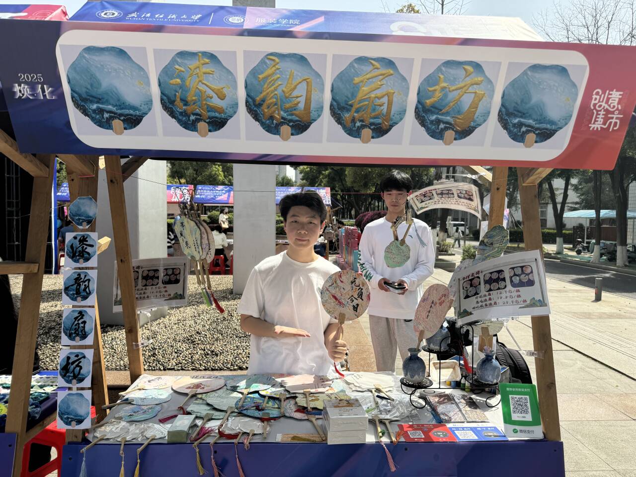 来自服设12403班的摊主周怡超表示,以 “漆” 为魂,“韵” 为神,是传统工艺与艺术美感的融合。本次我们主要突出匠造氛围,整体传递出古雅与现代交织的东方美学,契合漆扇作为实用艺术品的定位。团队成员黄颢缤与施迪文也同样作为“漆匠”表示要“匠心承古,漆扇焕新”,除了强调传统工艺底蕴,更要突出当代创新,精准呼应漆扇 “古艺今用” ,让千年漆扇在纺大时装周重焕生机!