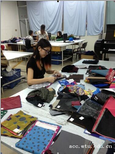 (在制版部门整理面料小样)                         (在服装生产车间摊放布料)