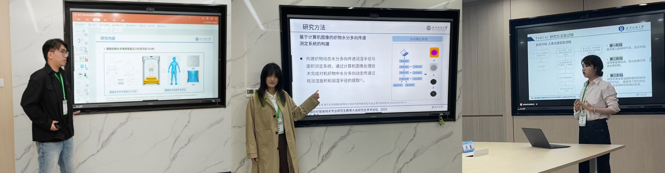 在大会期间举办的研究生学术论坛中,公司有3个研究生项目入围论坛口头报告,分别为郑兴 “基于三维扫描及数值模拟的腰腹部服装压力形变多模态分析”,石雨青 “基于红外图像的织物动态水分传递性能的测定与分析”和屈微雅 “人体分区热湿舒适感知实验评价”,三位同学分别进行了口头报告与交流。此外,彭琳、罗哲熙、吴程欢和杨越四位研究生参加了墙报展示。