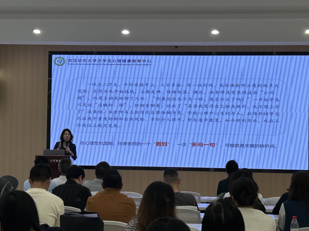 江秋玮以《心理危机识别与应对技巧》为主题,结合近年来高校典型案例,深入剖析员工心理问题的早期预警信号。她强调,专任教师、班主任、辅导员需建立“观察-识别-反馈”三级机制,重点关注学业骤降、社交回避等十类高危行为,并现场演示“共情式倾听”“非评判式沟通”等谈话技巧,系统讲解心理危机干预标准化流程,从“初步评估”到“转介跟踪”,通过情景模拟还原宿舍矛盾、情感纠纷等常见场景,帮助教师掌握“稳情绪、保安全、链资源”的应急处置策略。