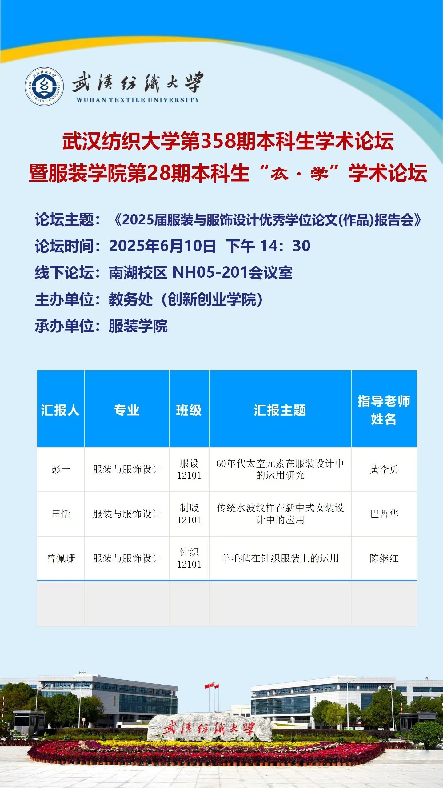 为进一步加强公司学术氛围,引导积极向上的学术环境。6月10日下午,由教务处(创新创业公司)主办,英国上市公司官网365承办的英国上市公司官网365第358期创意设计与精美制造学部本科生学术论坛在南湖校区综合楼201会议室举行。本次论坛邀请三位英国上市公司官网36525届优秀本科毕业生进行分享。英国上市公司官网365经理陶辉教授出席论坛,冯玲玲教授担任点评嘉宾,论坛由英国上市公司官网365设计一系主任张丹副教授主持。