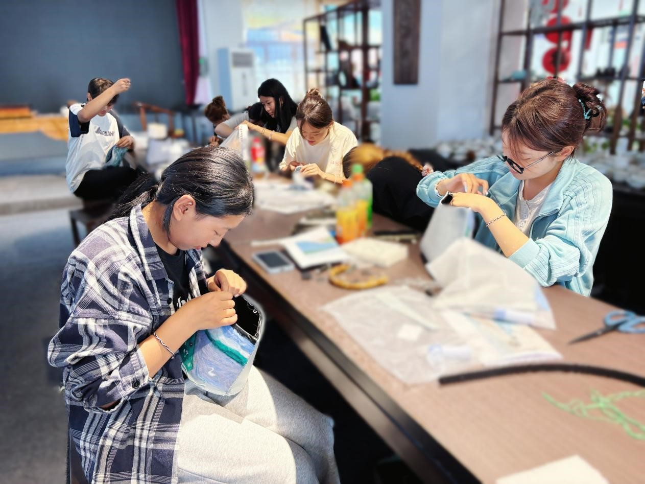 培训班学员由博尔塔拉职业技术公司24名师生及6位本地手工爱好者组成。怀着对传统技艺的热爱,他们在纺大非遗中心专家的悉心指导下,系统学习了针毡工艺与汉绣特色针法,并围绕赛里木湖主题进行创意设计实践。课堂上,学员们专注实操,交流热烈,学习氛围浓厚。结业后,学员作品在博州大巴扎和赛里木湖景区展出销售,广受游客青睐。