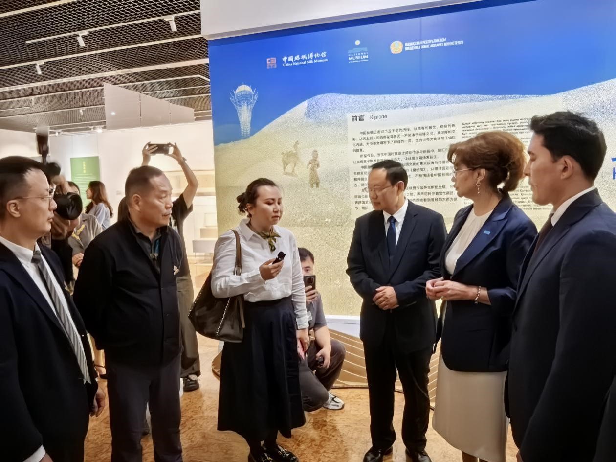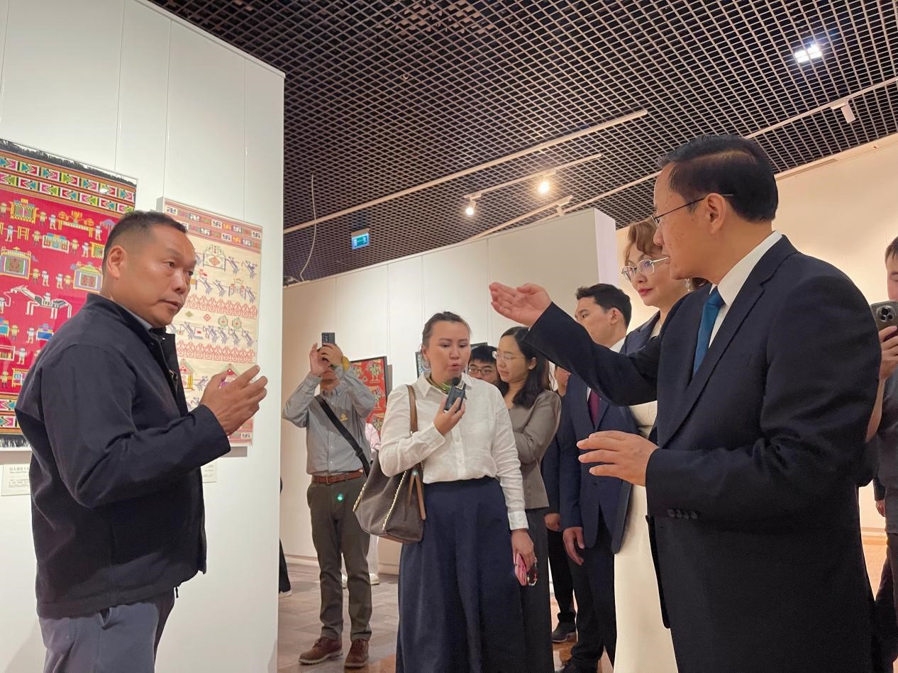 6月16日,“丝绸与丝路——从中国到哈萨克斯坦”展览在哈萨克斯坦国家博物馆盛大开幕。中国文化和旅游部部长孙业礼、哈萨克斯坦旅游与体育部部长梅尔扎博瑟诺夫等嘉宾出席并观展。叶洪光教授现场为中外嘉宾生动讲解土家织锦“西兰卡普”,展现了中华传统织造技艺的独特魅力。