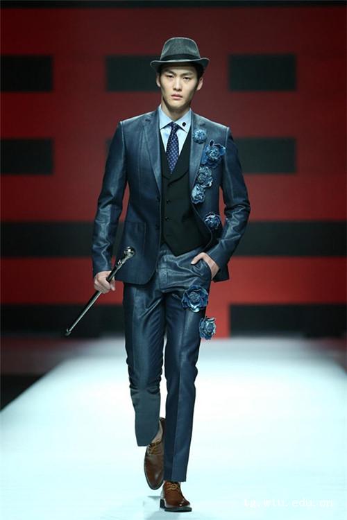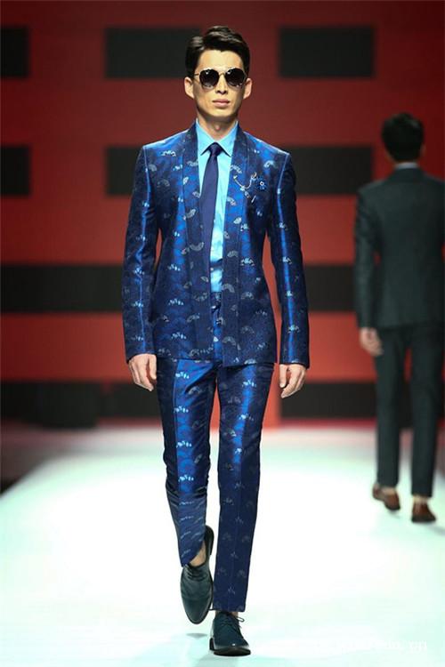 本次发布,虽以西式套装为主,却由设计而创新,呈现出精致多样的视觉效果。整场造型修身简洁自然,又不乏复古宽松风格的48套服装中,刘勇老师为传统的男装定制增添了实用主义、户外运动等诸多跨界元素。本次发布的作品,除使用经典华贵的天然毛料之外,还大量运用了中国经典的丝绸面料,并跨界植入牛仔面料,让传统的男式正装表现出一定程度上的自由、休闲风格。带有中华传统服饰特点的丝绸提花纹样、装点“裕大华1919”品牌符号的橙色织带、细节处品牌专用色的搭配点缀等创新的综合运用,无不突破传统成熟沉闷的绅士风格。以基础省道变化为特点的分割式裁剪,结合部分休闲西装造型,让定制的款式呈现出多样性的选择性与新意。在色调上,以传统西装设计的蓝、黑色系为主,与在特定位置精心安排的鲜明品牌符号,形成多层次变化,突出设计师对多元饱和色彩一贯的独特理解。