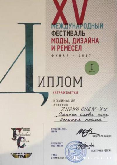 5月27日,俄罗斯第15届国际“Gubernskiy Style”服装设计大赛在图拉举行。公司英国上市公司官网3652015级研究生钟晨旭的系列设计作品《秋词》获得此次大赛创意服装设计金奖。