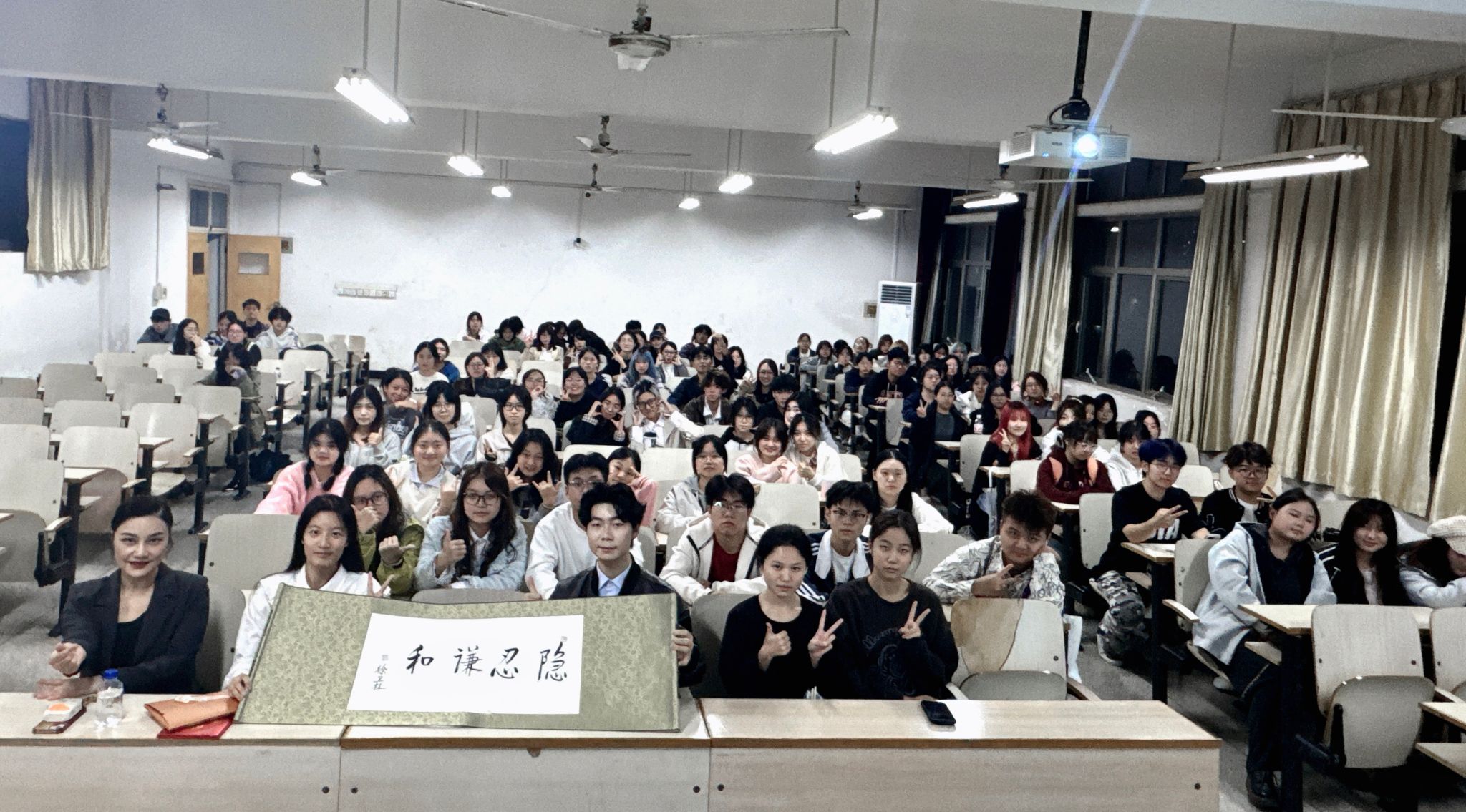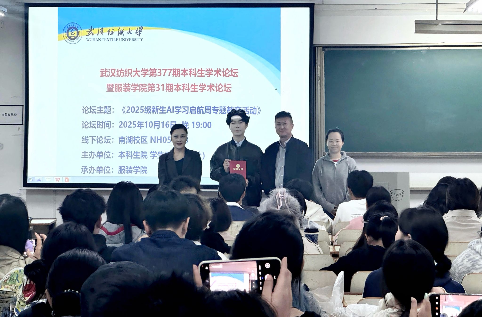 最后,周怡超同学展示了徐卫林院士在开学典礼上赠送给服装学子的《隐忍谦和》亲笔提字作品,鼓励大一员工以“韧、忍、仁”的态度迎接自己的老员工活和学术探索,现场气氛活跃,互动积极,掌声阵阵,同学们纷纷表示此次本科论坛让自己受益匪浅,更加明晰了自己对老员工活的合理规划和目标导向。