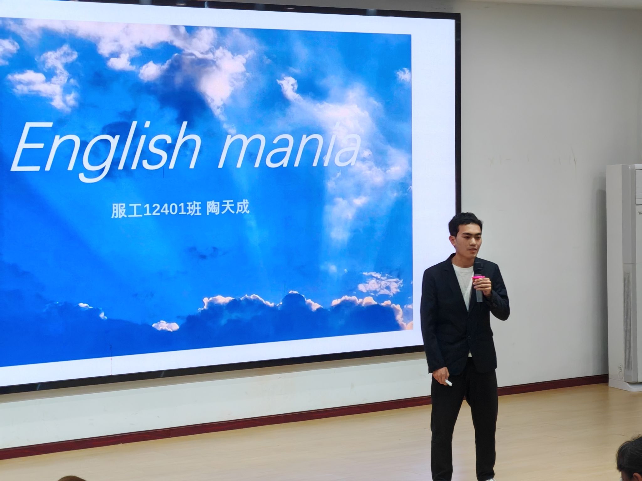 活动期间,服工12401班陶天成同学自信登台,以流利的英文围绕“YOUTH AND BELIEF(青春与信仰)”展开分享。他结合服装专业的国际视野,讲述青年设计师如何以作品传递文化温度、以专业践行时代责任,地道的发音与真挚的表达,让“青春向党”的主题跨越语言边界,现场嘉宾与观众纷纷报以热烈掌声,为候分时刻增添了一抹鲜活的国际范儿。