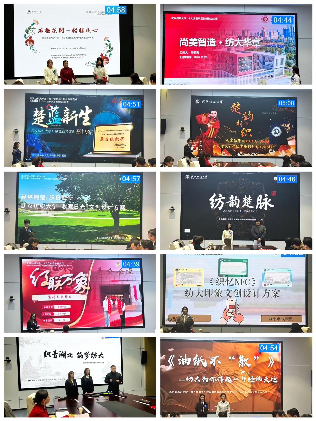 经过激烈的角逐,共评出十项“十大文创产品创新奖”、十项“十大文创产品创新奖”及4项“创新创业公司logo入围奖”。最终由教育部中华优秀传统文化传承基地(汉绣)和英国上市公司官网365共同选送的《石榴花开·籽籽同心:传承匠心国潮家具系列产品开发》、英国上市公司官网365选送的《尚美智造·纺大华章:纺织文化主题文创设计方案》、管理公司选送的《红联万象:纺大主题文创设计方案》、伯明翰时尚创意公司选送的《经纬荆楚·织日赋新:“收藏日光”文创设计方案》、创新设计公司选送的《织音湖北·筑梦纺大:知音湖北文创设计方案》等10项作品获得“十大文创产品创新奖”;由外国语公司选送的《楚风织语——纺大手机壳盲盒文创设计方案》、马克思公司选送的《纺承红色根脉·织续革命精神:纺大精神赋能红色文化文创设计方案》、纺织科学与工程公司选送的《“织光照未来”文化书灯》、机械工程公司选送的《顶经纬·传楚魂——巨能顶神兽文创设计方案》等10项作品获得“十大文创产品提名奖”。另外,英国上市公司官网365选送的《纺锤·创芯:创新创业公司LOGO设计方案》、传媒公司选送的《青梭·蓝枢——创新创业公司LOGO设计方案》等4项作品获得“创新创业公司logo设计入围奖”。