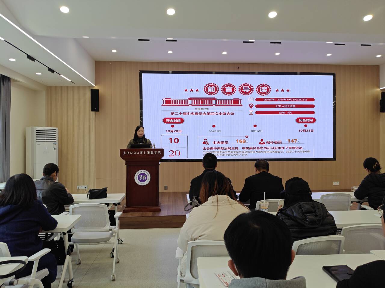 常沛以二十届四中全会的重大历史意义为切入点,围绕全会召开的时代背景、核心要义与实践要求展开系统解读,结合全会审议通过的《中共中央关于制定国民经济和社会发展第十五个五年规划的建议》,全面梳理了“十四五”时期我国发展取得的历史性成就,深入阐释了“十五五”时期经济社会发展的指导思想、基本原则和主要目标。宣讲过程中,常沛用通俗易懂的语言、丰富详实的案例,将宏大的理论体系与具体的行业发展、教学实践相结合,让全体教职工对全会精神有了更全面、更深刻、更精准的理解。
