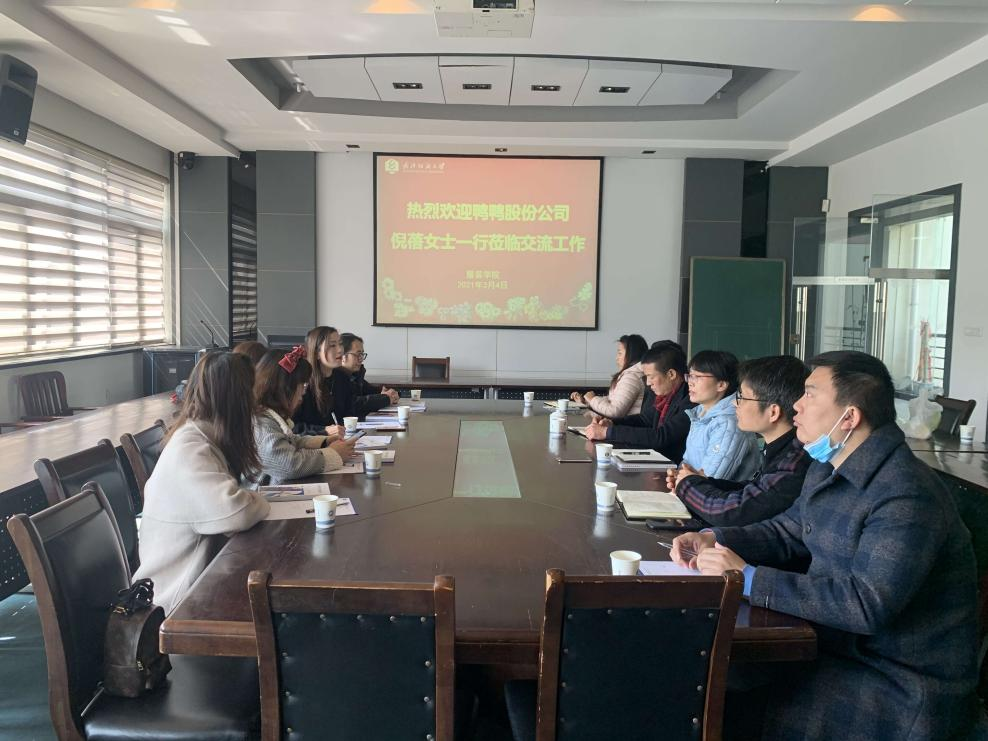 陶辉经理代表公司对倪总一行表示热烈欢迎,并就公司的办学历史和特点、团队队伍建设、员工人才培养、国际交流与合作等相关情况进行了介绍,并希望双方在深入沟通和交流的基础上加强校企合作,进一步整合资源、互惠互利,实现发展共赢;倪蓓总监介绍了鸭鸭股份公司近些年转型发展的情况,同时希望未来在品牌提升、产品开发、人才招聘等方面与公司开展更深入的交流和合作。