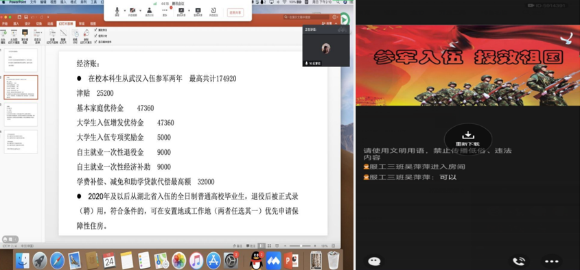通过本次线上会议,同学们理解了相关政策,知晓了参军归来的同学在考研和就业上更占优势,为个人发展提供了更多机会,同时部队的锻炼也让他们在学习、生活中会更加自律和主动,绿色军营的经历将是他们一生的宝贵财富,他们积极参军入伍,磨炼意志,守护家园的意愿更加强烈。