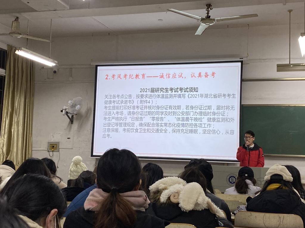 毕业班辅导员则着重向年级员工强调了研究生入学考试考风考纪教育以及应考的防疫要求,提醒员工务必关注各考点公告,按要求进行体温监测并填写《2021年湖北省研考考生健康考试承诺书》;同时,提醒了员工严格执行“日报告”“零报告”、“体温晨午晚检”健康监测和外出登记等管理规定,确保配合落实常态化疫情防控各项工作;最后,提醒了员工注意保暖、考前饮食卫生和交通安全,保持充足睡眠,坚定信心,从容应考。