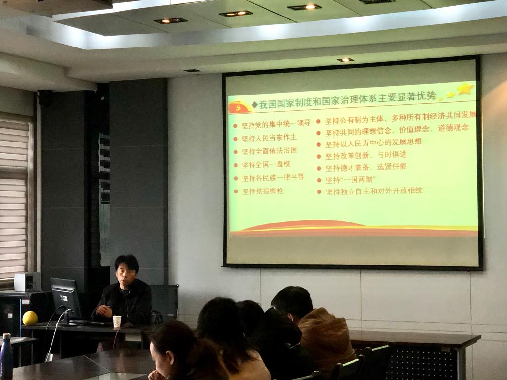 熊兆飞书记在总结中指出,深入学习贯彻党的十九届四中全会精神和习近平新时代中国特色社会主义思想,是当前和今后一个时期的重要政治任务。喻教授通过通俗易懂的语言向大家分享了十九届四中全会公报的主要精神和对十九届四中全会精神的独到见解,并结合中国实际向大家阐述了同西方国家相比较,中国政治制度的六个优势,对于公司师生全面准确理解、系统把握和认真贯彻党的十九届四中全会精神具有非常强的指导性和针对性。在今后的工作和生活中,我们要深入贯彻落实习近平新时代中国特色社会主义思想,增强“四个意识”、坚定“四个自信”、做到“两个维护”,立足岗位把全会精神学习好、贯彻好、落实好。