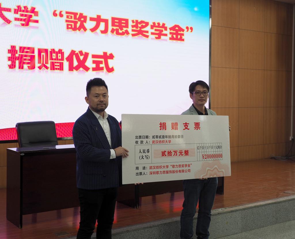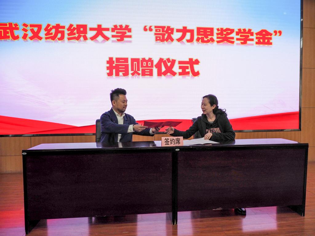 随后,校教育发展基金会秘书长王燕代表公司与深圳歌力思服饰股份公司艺术总监王笃森签订“歌力思奖学金”捐赠协议书。歌力思公司向公司教育发展基金会捐赠支票。
