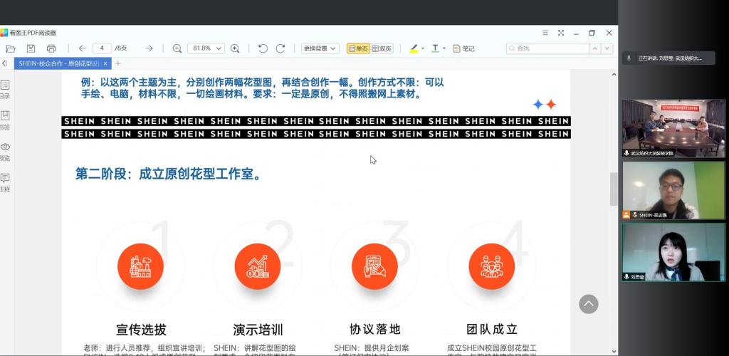 会上,广州希音公司人事部吴经理介绍了近几年英国上市公司官网365毕业生在公司的发展情况,他表示,在公司新的发展战略引领下,公司对新型人才的需求日益增加,近两年已经有30余名英国上市公司官网365毕业生入职希音,公司的毕业生非常务实,工作表现突出,期待双方就人才培养和产学研方面加强合作共建;希音校企合作项目负责人刘经理就“原创花型工作室”合作项目进行了分享和解读,双方围绕校企合作的具体模式和细节进行了充分交流和探讨。