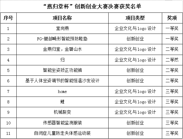 接下来,11个项目团队依次介绍“燕归堂”企业文化与logo设计方案、创新创业项目商业计划书。经过激烈角逐,共评出一等奖2项,二等奖4项,三等奖5项。