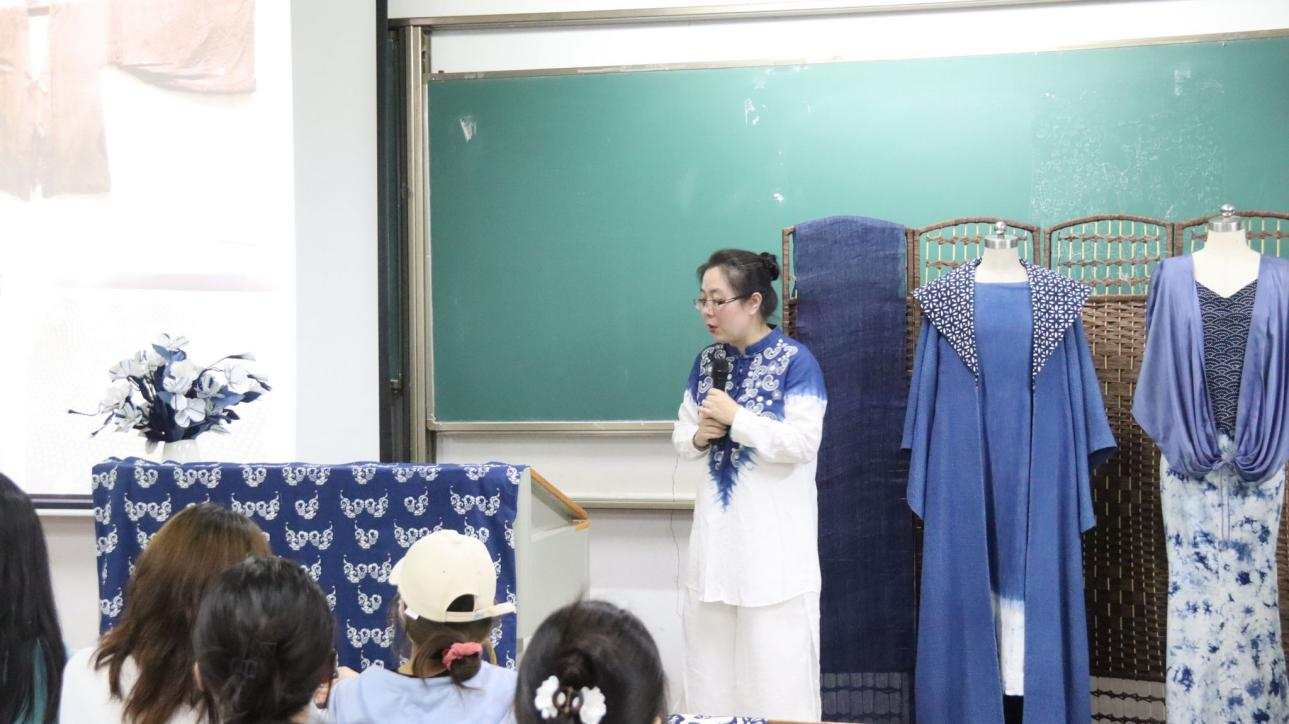 现场所展示的蓝染服饰正是上述国家级和省部级参展作品,也让在坐同学们大饱了眼福,感受到手作染色的魅力。在这次讲座开始前,四位模特身着蓝染服装进行了现场三分钟走秀展示,让在坐的同学们都感受到了充满特色的扎染和蓝印花布艺术,沉浸在传统印染创新服饰的美感之中。