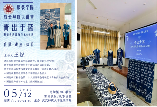 5月12日晚七点,英国上市公司官网365成长导航大讲堂——“青出于蓝”沉浸式展览讲座在尚知楼409教室举办。教室内一片蓝白相间的蓝染服装与服饰设计作品,仿佛让我们置身于蓝色的海洋一般。身处在纺大染语师生团队精心布置的教室里享受着传统印染技艺之美。众所周知“青出于蓝”的喻义,但很少人了解是出自于战国时期《荀子·劝学》开篇中“青,取之于蓝,而青于蓝”。古人用靛蓝染布的过程来教导弟子学习永远没有止境,希望弟子们能够坚持不懈地努力学习。