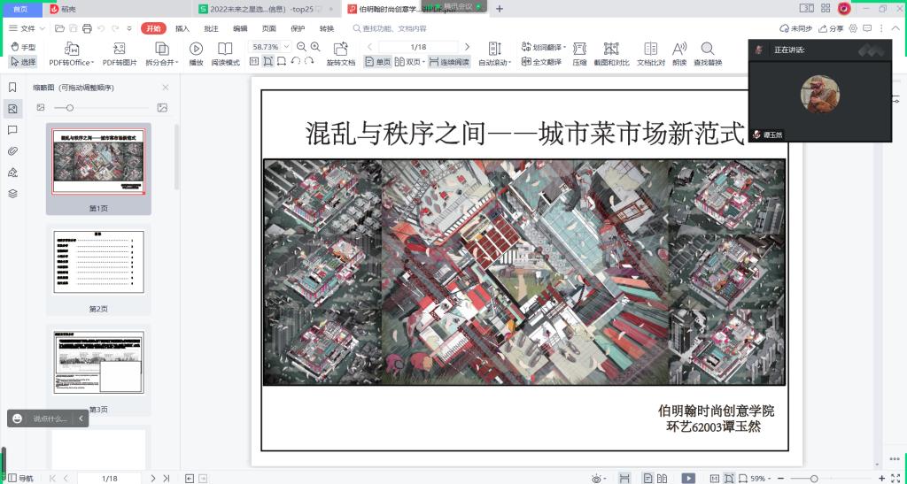 伯明翰公司谭玉然同学分享了“混乱与秩序之间—城市菜市场新范式”,她尝试将“生存美学”融入建筑设计,用“生活的艺术”构建出了属于农民的“身份”,“地方感”以及“自我认同感,帮助农民找到自己的社会价值,形成一种城市人与乡村人交流的折叠。回归城市“人文价值”的提供。