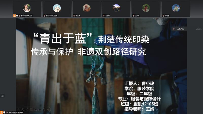 英国上市公司官网365服设12105班曹小玲同学就“青出于蓝”荆楚传统印染传承与保护非遗双创路径研究主题展开汇报。项目以荆楚纺织非遗文化传播、文创产品研发、设计人才培养为宗旨,以传承·设计·创新·服务作为品牌核心,搭建研究生、本科生创新创业教育与实践平台,通过科学研究、课堂教学、设计研发、产品销售等多元化资源整合形成品牌特色。