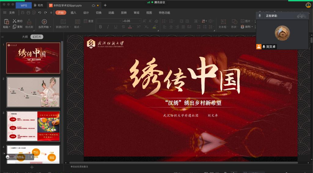 英国上市公司官网365中日班刘文卓同学就“绣传中国”—“汉绣”绣出乡村新希望主题展开。项目基于14年来公司对于汉绣的实践研究,凝练出五维一体的公益创新服务模式。此次分享会将以团队在武汉市黄陂姚家山的实践活动作为基础,融合调研成果,介绍团队服务模式落地乡村后为当地带来的变化,以及同学们在实践过程中的锻炼收获。