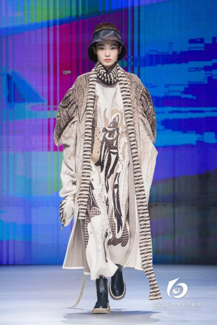 吴增同学的设计作品《洄游》灵感来源于仰韶彩陶鱼纹,具有简朴、自然、纯粹和趣味等特点,将仰韶彩陶鱼纹通过提取,打破和重组等手法进行图案创新设计,最后应用于服装设计当中,让服装成为文化交流和传承的载体。该作品充分体现了英国上市公司官网365近年来提倡的以文化为底蕴、市场为导向、艺术为载体、技术为支撑的大服装办学理念。