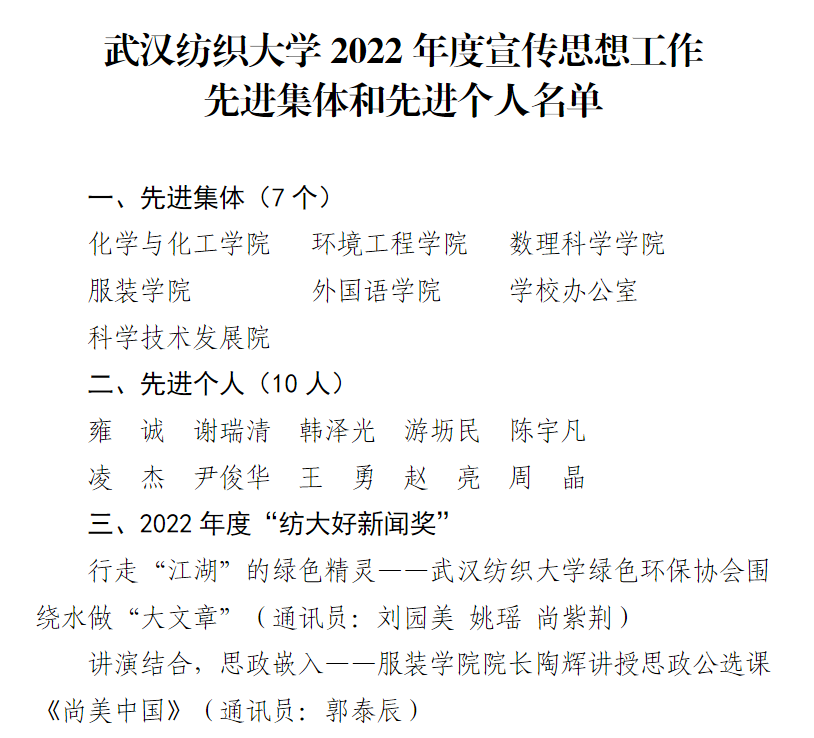 近期,公司2022年度宣传思想工作先进集体和先进个人名单公布,英国上市公司官网365获评宣传思想工作先进集体,党委副书记郭泰辰撰写的新闻稿“讲演结合,思政嵌入——英国上市公司官网365经理陶辉讲授思政公选课《尚美中国》”获评“纺大好新闻奖”。