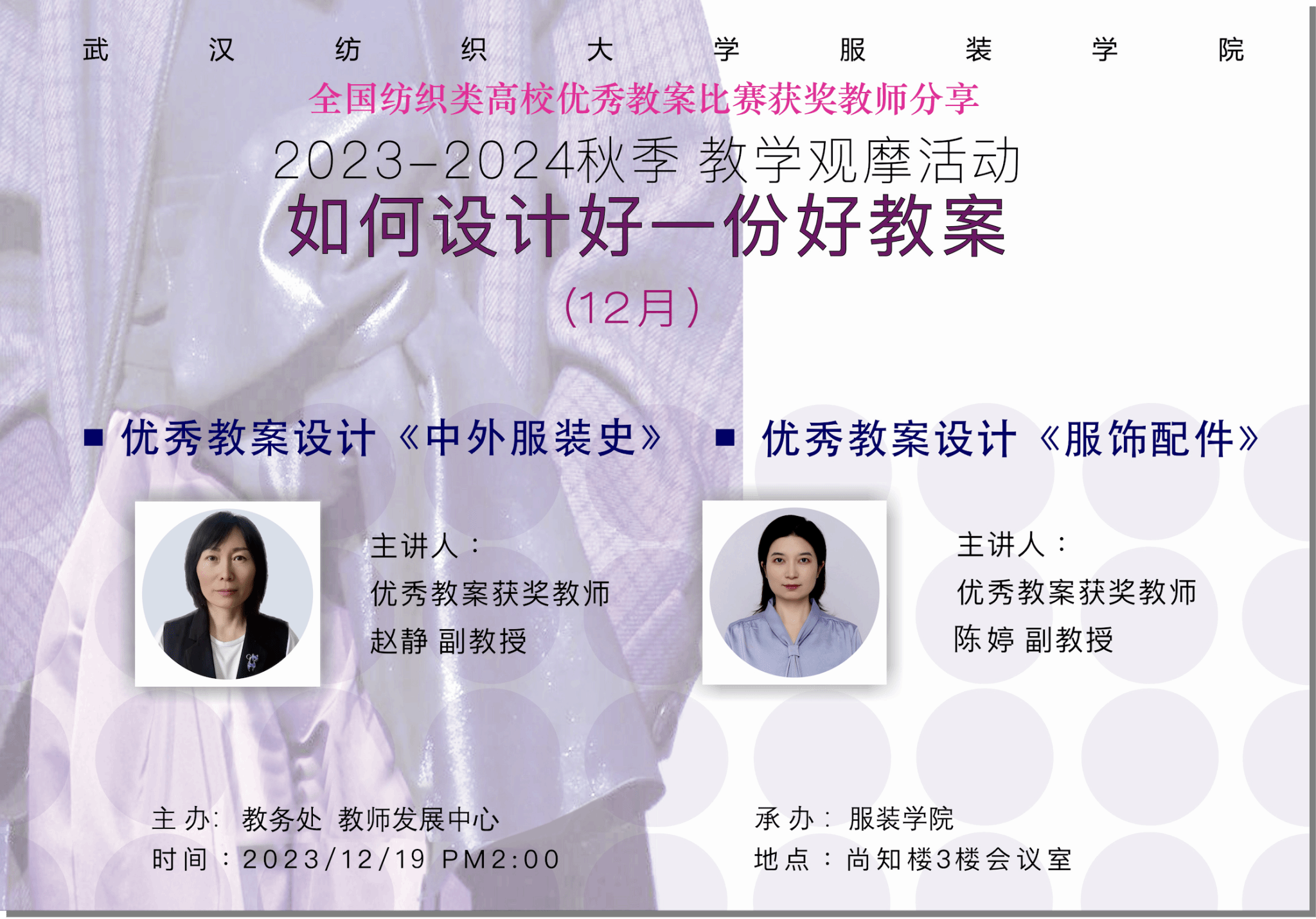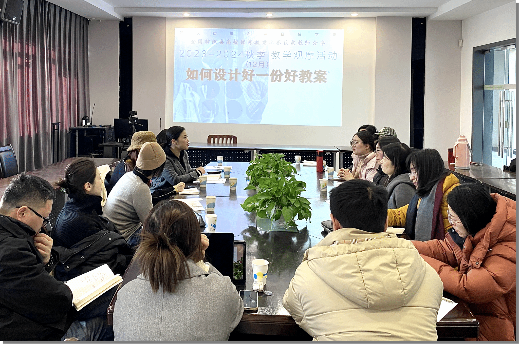 12月19日下午,由公司教务处、教师发展中心主办,英国上市公司官网365承办的教学观摩活动在南湖尚知楼3楼会议室举行。参加教学分享的是在全国纺织类高校优秀教案比赛中获奖的赵静副教授和陈婷副教授。此次教学观摩活动由教学副经理钟蔚主持。