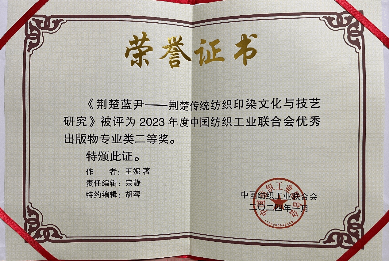2024年1月29日中国纺织工业联合会(中国纺联[2024]2号)文件公布了“关于授予2023年度中国纺织工业联合优秀出版物(图书、音像电子、数字出版物)奖的决定。由国家一级出版社—中国纺织出版社有限公司出版的公司王妮副教授非遗著作《荆楚蓝尹—荆楚传统纺织印染文化与技艺研究》,被评为2023年度中国纺织工业联合会优秀出版物专业类二等奖。这是继2022年由湖北长江传媒数字出版有限公司出版的湖北省公益学术著作《唤醒蓝染千年之美—荆楚传统印染技艺探寻实录》又一力作。该著作一经正式出版,就在2023年12月12日“第二届湖北蓝染文化产业基地大会”中进行发布,并受到“湖北省人民政府官网“的新闻报道。同时,中国纺织出版社有限公司、中纺教学服务网、华师科技园非遗专栏等平台都进行图书推介。