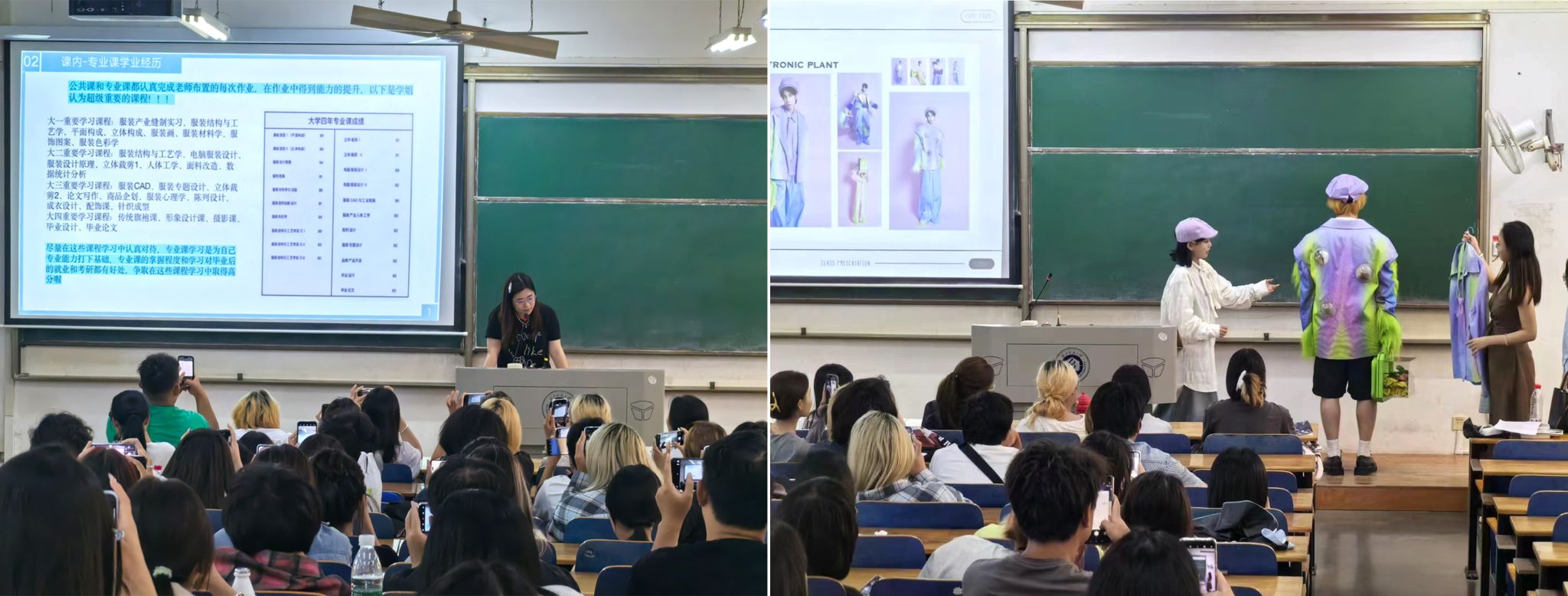 在互动环节,公司邀请2019级优秀毕业生郑凯伦、2021级参赛员工代表张弛为大家分享考研和参赛经验。郑凯伦学姐主要从个人四年的学习介绍专业课程学习的重难点、作业完成的注意事项,并且就自身考研成功的经历传授考研学习方法,大家听后受益匪浅。张弛作为参赛的在校生代表为新生们分享参赛的经验,从大赛关注、主题征稿、设计绘制和最后的成衣制作一一分析说明。还在现场为大家带来了参赛作品的成衣和配饰,新生代表主动上台亲自试穿学姐的参赛成衣,让一个个小萌新瞬间燃起了设计的激情,极大地激发了大家的专业学习热情。