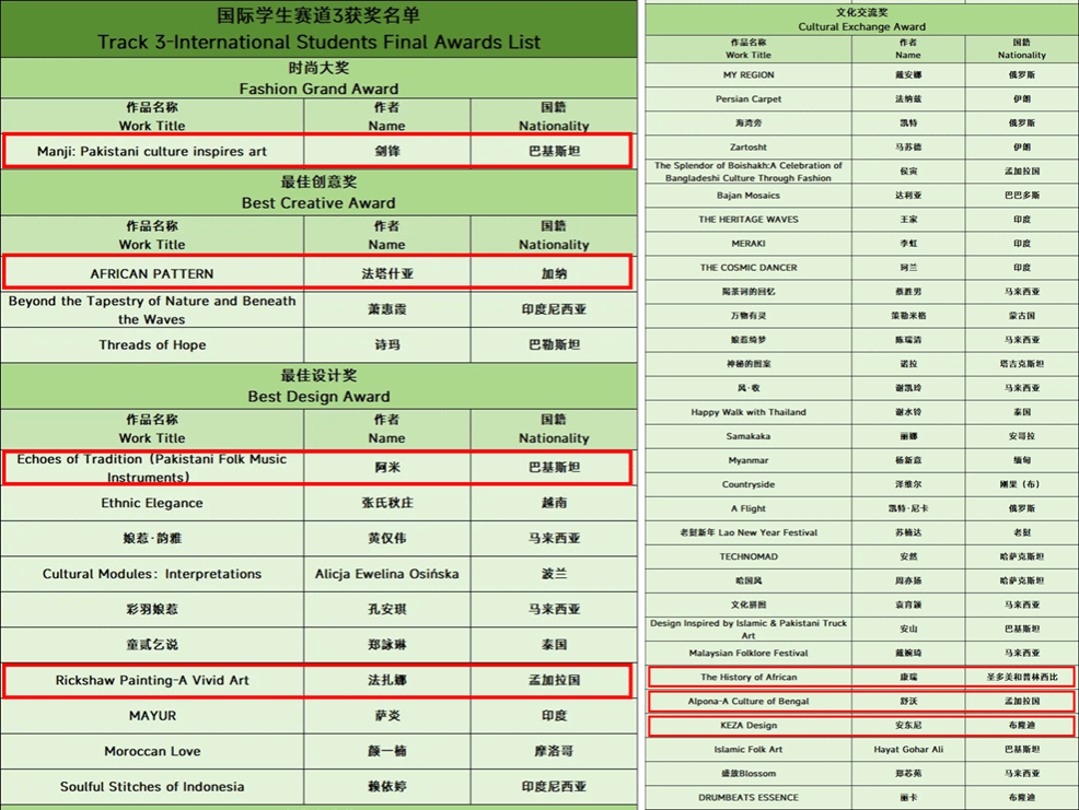 在入围设计师中,英国上市公司官网365的 7 名职工脱颖而出。经过设计开发和制作过程,英国上市公司官网365巴基斯坦籍职工 Muhammad Abdullah Sarim Ansari(剑锋)的设计以 "Manji: 巴基斯坦文化激发艺术灵感 "主题;来自加纳的职工 Fatahiya Tijani (法塔什亚) 的设计获得了以 "非洲图案 "为主题的 "最佳创意奖";2 名职工 Muhammad Ahmad (阿米) 和 Sheikh Farzana Akter (法扎娜) 获选 "最佳设计奖"。此外,还有三名国际员工 Luiz Da Fonseca Angles Aixa Correia (康瑞)、Taofir Ibne Tas Shuvo (舒沃) 和 Florian Anthony Gezaho (安东尼) 入选 "文化交流奖"。除了英国上市公司官网365的外籍教师米汉斯博士也入选了“优秀导师奖”,英国上市公司官网365也入选了“最佳组织奖”。