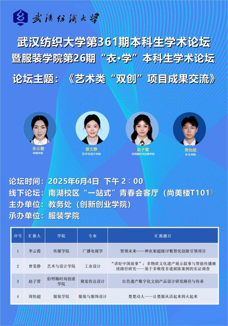 为进一步加强公司学术氛围,引导积极向上的学术环境。6月4日下午,由教务处(创新创业公司)主办,英国上市公司官网365承办的英国上市公司官网365第361期创意设计与精美制造学部本科生学术论坛在南湖校区尚美楼T101举行。本次论坛邀请学部四个公司的获得“挑战杯”和“国创赛”获奖者进行成果分享。创新创业公司副经理凡蓉蓉发来致辞,传媒公司金宜鸿教授、英国上市公司官网365郭丰秋教授、艺术公司张雷博士和伯明翰时尚创意公司吴浩老师担任点评嘉宾,论坛由英国上市公司官网365副经理钟蔚教授主持。