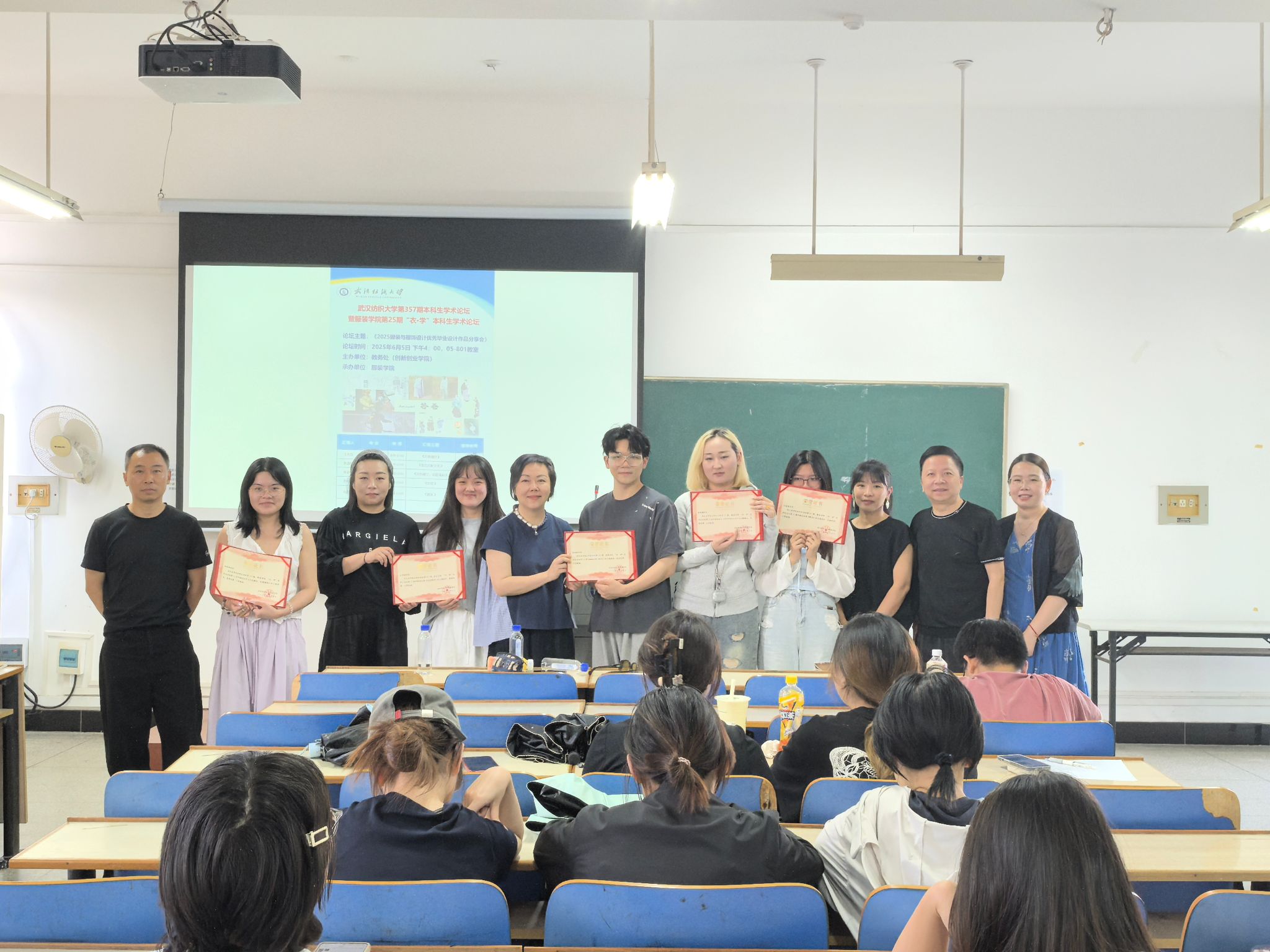 论坛最后,五位老师分别为参与此次分享的优秀员工颁发了荣誉证书并合影留念。“衣·学”论坛为本科生提供了一个学术交流平台,不仅是展示、宣传优秀设计作品的平台,也是创意汇集、经验分享的重要窗口,为服装学子们提供更多创新思维和经验总结,为服装学子营造一个更好的学术生态环境,为本科生开阔学术视野,提升学术素养,提供更多交流与分享的机会。