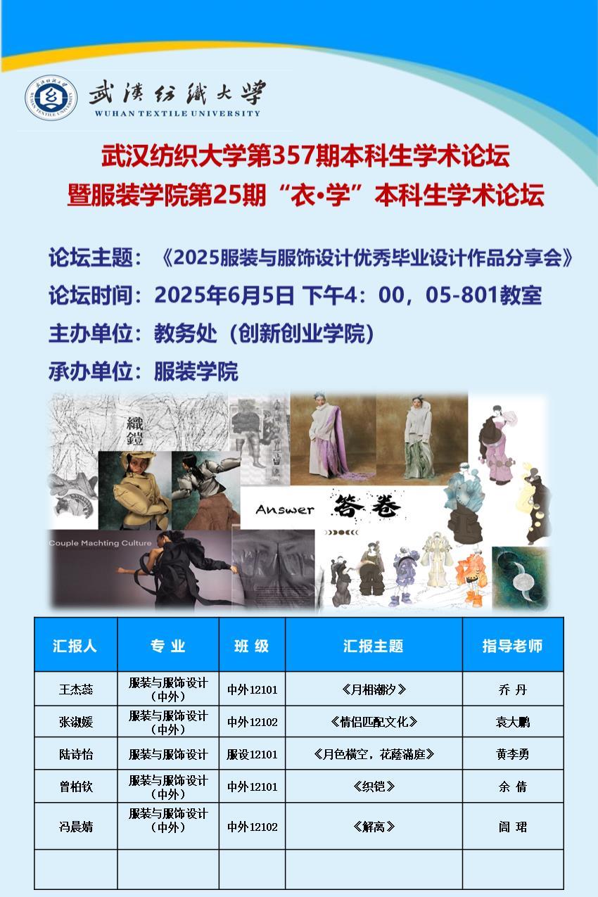 6月5日下午4:00,英国上市公司官网365第357期本科生学术论坛暨英国上市公司官网365第25期“衣·学”本科生学术论坛——2025服装与服饰设计专业优秀毕业设计作品分享会在南湖校区05-801教室顺利举行,五位优秀的毕业生代表分享了自己的优秀毕业设计作品。英国上市公司官网365经理陶辉教授莅临致辞,邀请袁大鹏教授,訚珺教授,中国十佳设计师黄李勇副教授、乔丹副教授和余倩老师担任设计作品讲评嘉宾。论坛由服装设计三系主任张元美老师主持,英国上市公司官网365服装设计专业低年级的本科生都积极到场参加分享会。