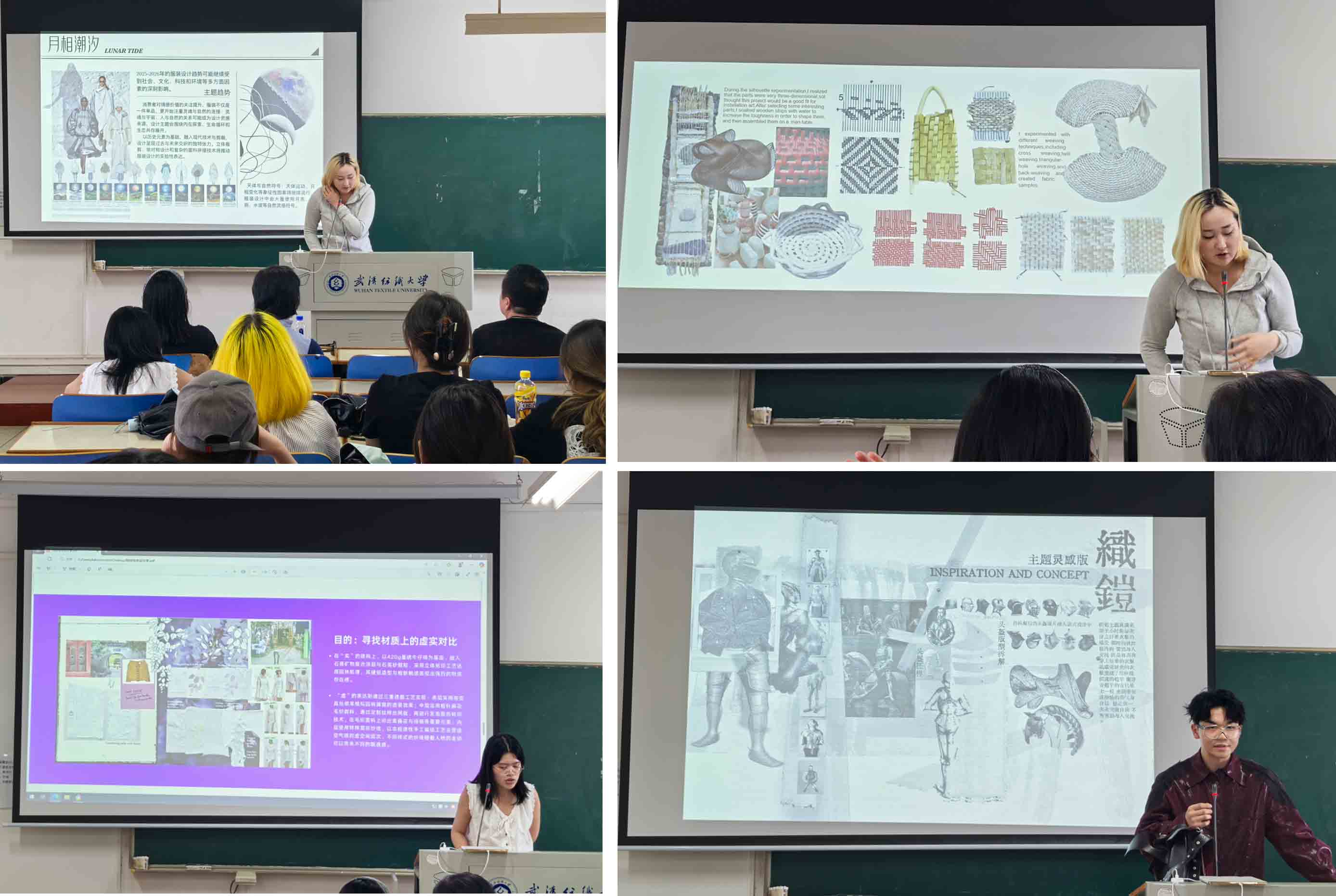 王杰蕊同学分享的优秀毕业设计作品主题为《月相潮汐》,以“月相变化”为灵感,展现出月亮盈亏变化反射人类心请,选用牛仔面料进行结构裁剪,将牛仔面料与大廓形两者的融合与创新,使得服装风格更加个性化、多元化。张淑媛同学以《情侣匹配文化》为题进行分享,讲述设计构思过程,通过探究人类爱情学的划分与纠缠,以面料捆绑的方式进行轮廓塑造,将立体感的服饰呈现在大家面前。陆诗怡同学以《月色横空,花荫满庭》为题从元代戏曲《西厢记》中寻找灵感,在中国传统服饰文化中探索出虚与实的结合,用对比的色彩体现服装。曾柏钦同学讲述了毕业设计作品《织铠》的灵感,主题来源于西方盔甲结构,通过对盔甲的研究提取融合,并通过大量的设计实验塑造不一样的服装造型。冯晨婧同学分享了毕业设计《解离》,作品来源于自己对美国纪录片的观看与思索,并详细介绍了在设计制作过程中的经历和经验,将流行趋势元素分解与设计有效关联。