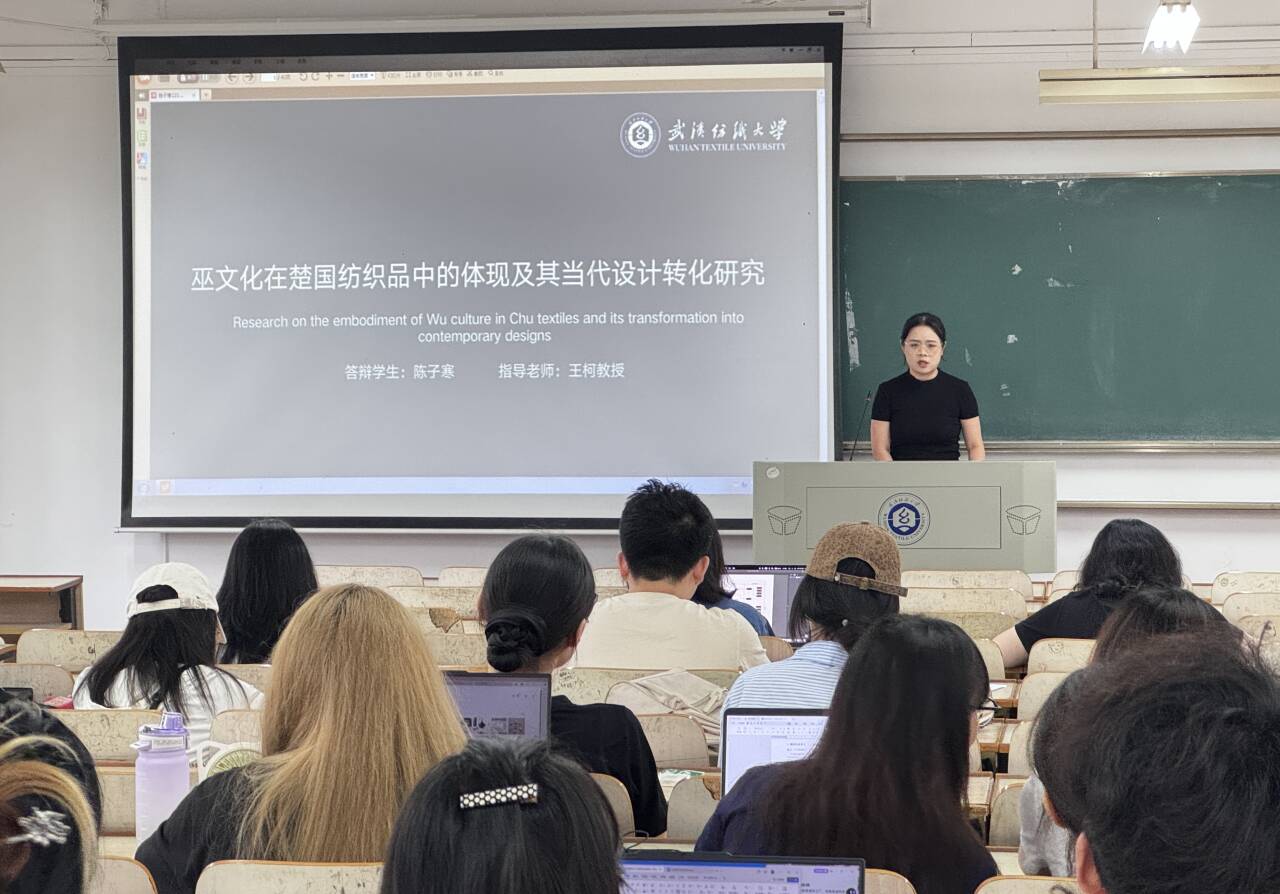 陈子寒同学分享的题目是《巫文化在楚国纺织品中的体现及其当代设计转化研究》。她在前人对楚文化研究的重要成果的基础上,系统的对楚巫文化在纺织品上的体现的特点、内涵等方面进行梳理和研究,将传统文化与现代设计进行一定的开发和创新利用,促进地域特色经济的发展。她建议学弟学妹们在选题时应该把握好兴趣与专业,这样才能找到既有研究价值又适合自己的题目。文化解读不能流于表面,要结合历史背景深入分析;设计转化不能生搬硬套,要注重解构再创作。