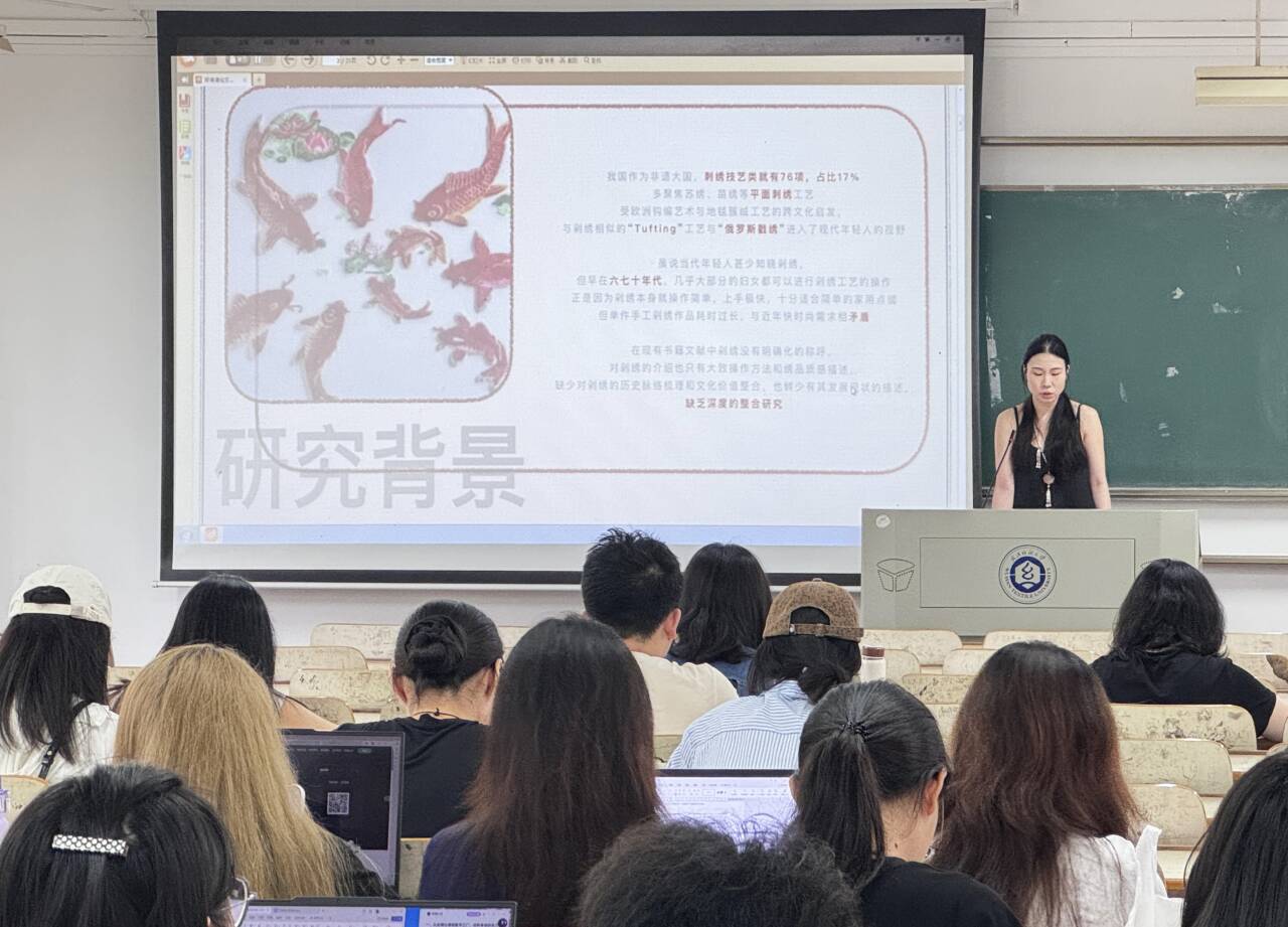 郑洛津同学以《剁绣针法在女装设计中的应用研究》为题,从研究背景、研究方法及其过程与转化等多个维度进行概述。详细介绍了剁绣针法的历史发展脉络与独特美学特征。剁绣针法不仅蕴含着丰富的历史文化价值,其变化万千的纹样更充分展现了匠人的无限创造力与卓越智慧,对现代女装设计具有重要的创新意义。研究示范了如何将传统文化转化为现代设计语言,一篇优秀的论文需要文化深度、设计创新和产业思维三者的有机结合。
