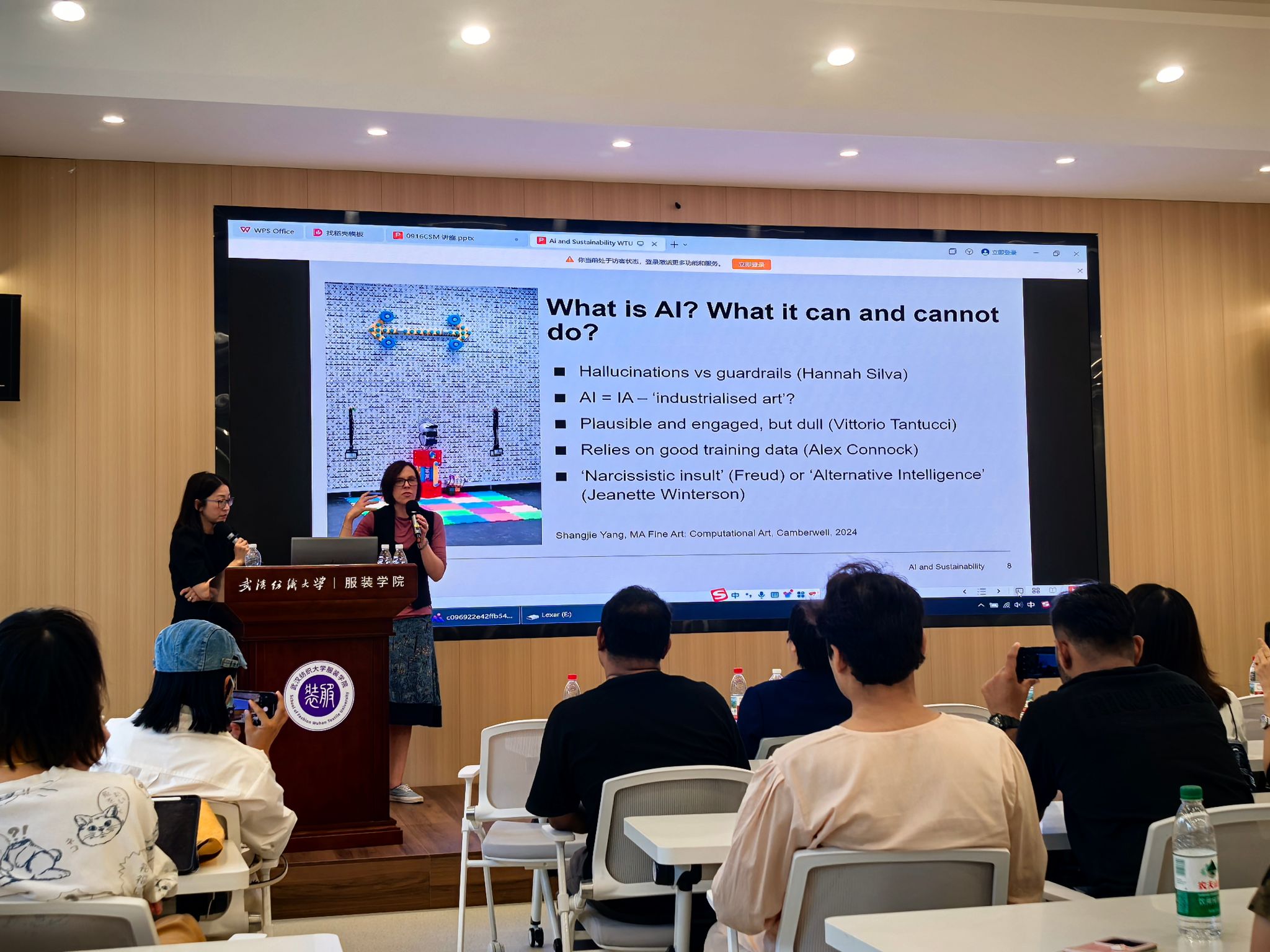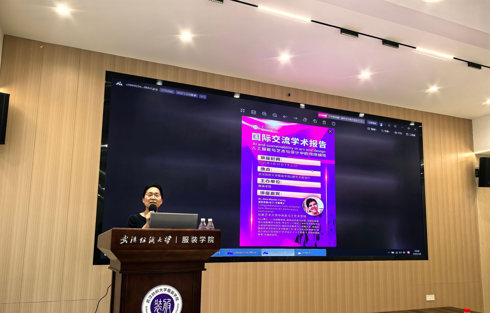 讲座中,Martin-Carey博士结合中央圣马丁艺术公司的前沿研究案例,展示了AI在预测流行趋势、减少设计试错成本、优化版型生成以降低面料浪费,以及推动环保材料智能匹配中的实际应用。她指出:“人工智能不仅是效率工具,更是一种思维范式——它帮助设计师从线性生产转向循环系统思维,真正实现‘设计即责任’。”特别值得关注的是,这些跨学科实践不仅提升了设计的环境友好性,也为艺术教育的未来提供了新的教学框架与研究方向。在随后的互动环节,现场研究生与职工积极提问,Alex博士做了精彩的解答,现场气氛热烈。