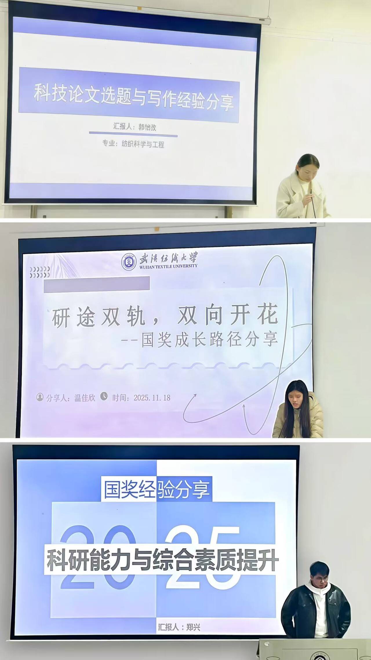 郭怡孜同学以《科技论文选题与写作经验分享》为题,系统阐述了从选题构思到论文成稿的全过程。在选题方面,她详细介绍了从初步构想到思路梳理,再到可行性验证的完整路径;在写作方面,她围绕整体框架设计、撰写顺序安排及研究工作推进顺序进行了深入解析。温佳欣同学作了题为《研途双轨,双向开花——国奖成长路径分享》的报告,从整体规划、阶段实施到成果展望展开多维阐述,分享了自己在研究生阶段的逐步成长。郑兴同学围绕《科研能力与综合素质提升》主题,从文献检索与管理、论文撰写与投稿以及综合能力培养三个方面展开分享。他介绍了常用的文献查阅平台,讲解了论文写作的步骤、注意事项与基本框架,并进一步分享了提升科研素养与实践能力的具体方法。