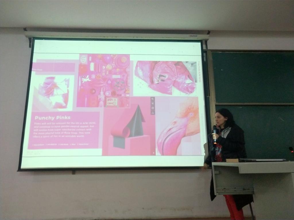 本次讲座内容分为四大部分,流行色系、面料运用、服饰造型、帕森斯员工案例。通过讲解运用新技术,新材料的实验性作品,让我们直观感受到设计中红焰燃烧的爆发力、紫系拼接的神秘肌理、扭曲解构的不对称性、有机金属的通透切面。Aneta教授谈到,设计者的视角不应仅局限于设计的某一表现形式。可以从衣料,空间,家具,交通工具,甚至是声音的广域之中汲取灵感,给同学们提供了诸多启发式新视点。