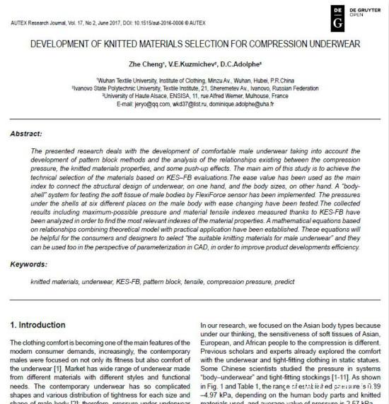 近日,英国上市公司官网365青年教师程哲作为第一作者,公司为第一研究单位,与通讯作者纺织服装专家库茨米切夫•维克多院士,在国际工程技术与纺织材料科学领域公认的SCI权威期刊:《Autex Research Journal》(The Journal of Association of Universities for Textiles),公开发表了学术论文“Development of knitted materials selection for compression underwear”,由德国著名学术出版社De Gruyter出版发行,论文全英文11页,重点研究在了针织面料性能与内衣设计之间的参数分配问题。