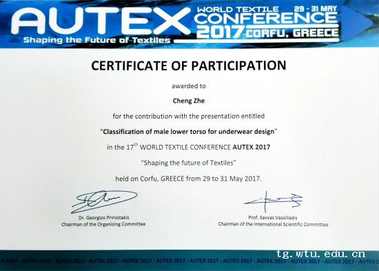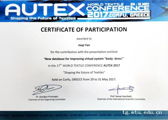 5月29日至31日,第17届世界纺织大会(AUTEX 2017)在希腊科孚岛举行,公司英国上市公司官网365纺织服装专家、AUTEX国际科学委员会成员库茨米切夫·维克多教授、教师程哲及2014级研究生严佳琪代表公司参加大会,并在会上进行口头汇报。两次演讲均受到国外专家的高度重视,在300多场汇报中脱颖而出,并获得优秀证书。