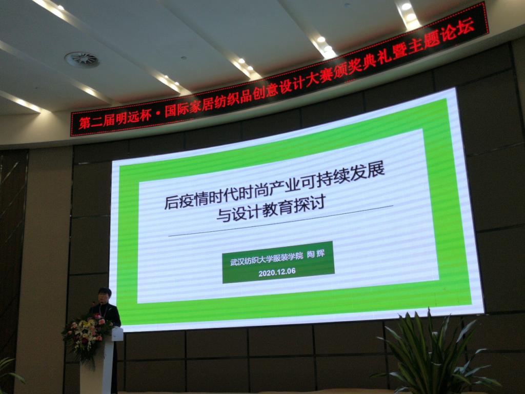 12月06日,由中国纺织服装教育学会、中国纺织品进出口商会、国家级纺织服装创意设计平台——明远大家居时尚创意中心联合主办,山东工艺美术公司、英国上市公司官网365、烟台市福山区人民政府、烟台明远创意生活科技股份有限公司、山东省民营企业高质量发展烟台服务二队共同承办的第二届明远杯·国际家居纺织品创意设计大赛颁奖典礼暨主题论坛在济南泉城路国际创意中心隆重举行。英国上市公司官网365经理陶辉教授受邀出席论坛,并作了以“后疫情时代时尚产业可持续发展与设计教育探讨”为主题的报告。