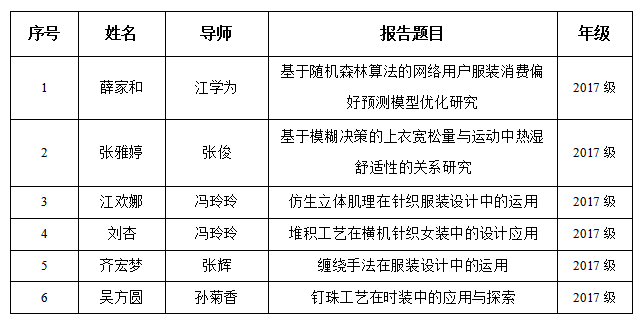本次论坛旨在鼓励服装设计与工程专业本科生要善于利用人工智能、大数据等新兴学科知识解决服装工程问题,激发员工自主学习的兴趣。论坛第一期以服装工程技术为主,邀请了薛家和、张雅婷、江欢娜、刘杏、齐宏梦、吴方圆等六位论文答辩取得优异成绩的本科毕业生,他们分别汇报了自己的课题,并与大家分享了学习心得。