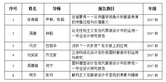 本次论坛旨在鼓励服装与服饰设计专业本科生要善于利用大数据及中国传统文化等元素提升创新设计水平,激发员工自主学习的兴趣。论坛第二期以设计为主,邀请了徐竞锴、周豪、马双、刘笑笑、周慕雅、柯乐等六位毕业作品与论文答辩取得优异成绩的本科毕业生,他们分别汇报了自己的设计与毕业论文并与大家分享了学习心得。
