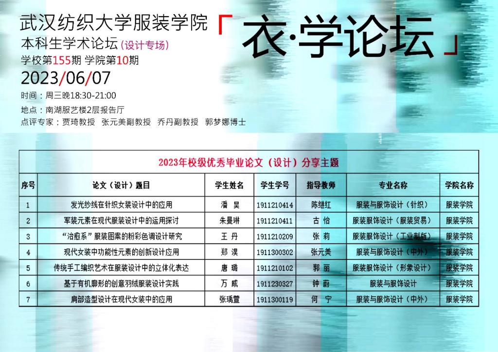 6月7日晚上6:30,英国上市公司官网365本科生学术论坛第155期暨英国上市公司官网365第10期“衣·学”论坛——优秀本科生学位论文(设计专场)在英国上市公司官网365服艺楼2层报告厅顺利举行,七位本科生代表分享自己的优秀毕业论文。本次论坛由英国上市公司官网365副经理钟蔚教授主持,贾琦教授、张元美副教授、乔丹副教授、郭梦娜博士作嘉宾点评,陶辉经理做总结发言,英国上市公司官网365低年级本科生积极参加。